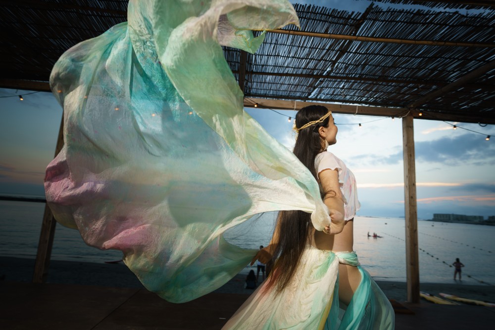 女神のベリーダンスクラスは、ベールで自由に、かろやかに、夏の空と溶け合い「風」のエレメントを踊ります。