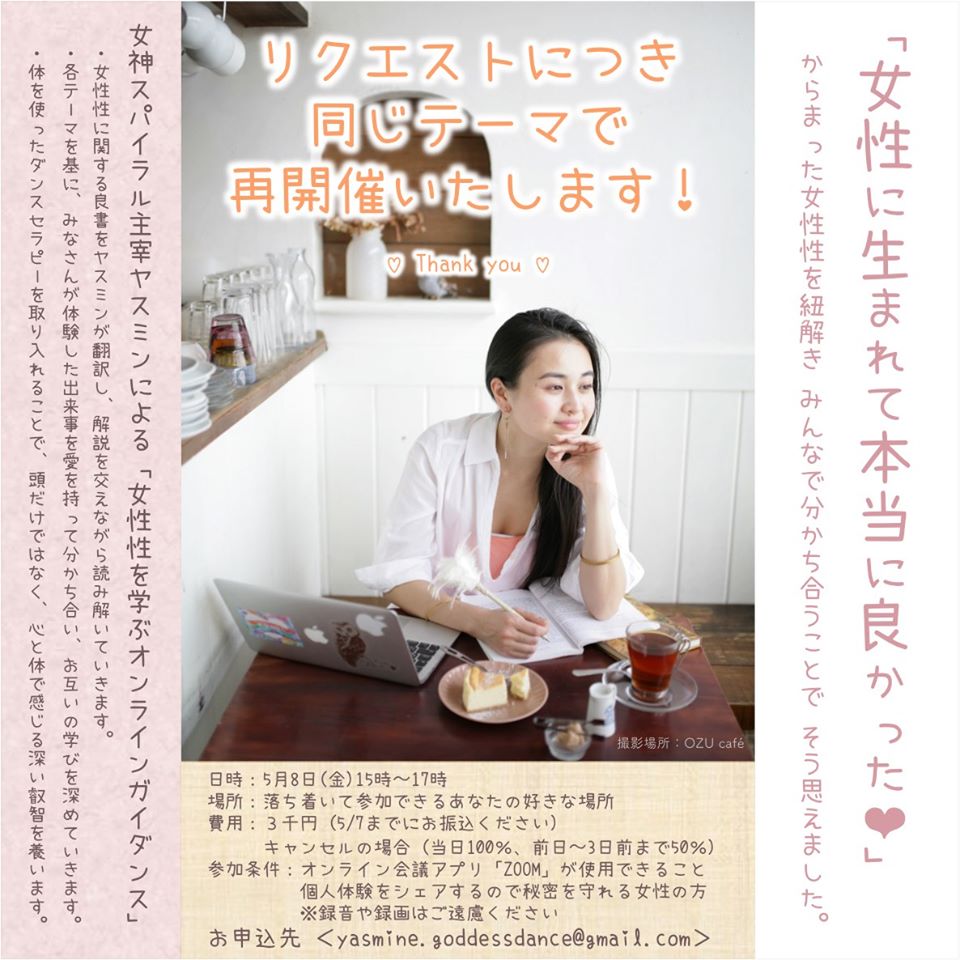 「女性性を学ぶオンライン・ガイダンス」、前回のテーマでリクエストを頂戴した為、5/8(金)に再開催が決定しました!あと6名様で満席になります!テーマと詳細は、以下になります。「女性性を学ぶ オンライン...